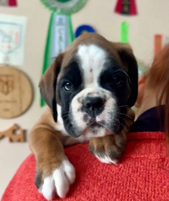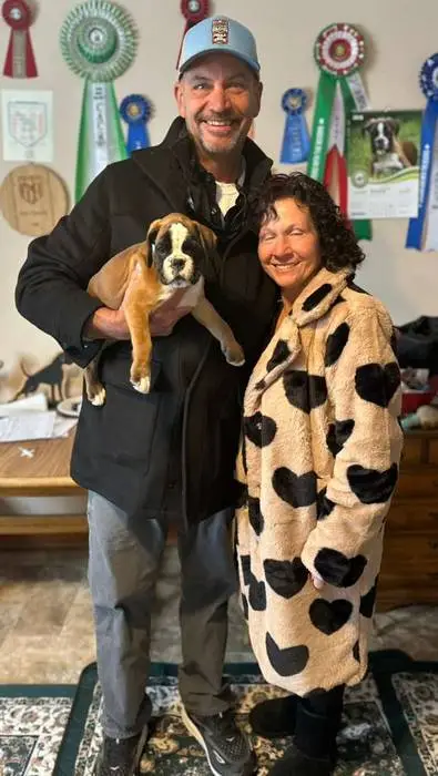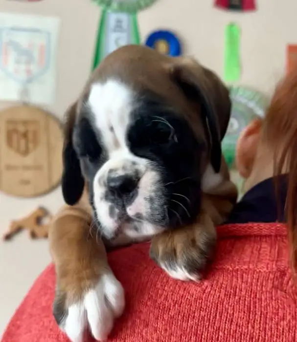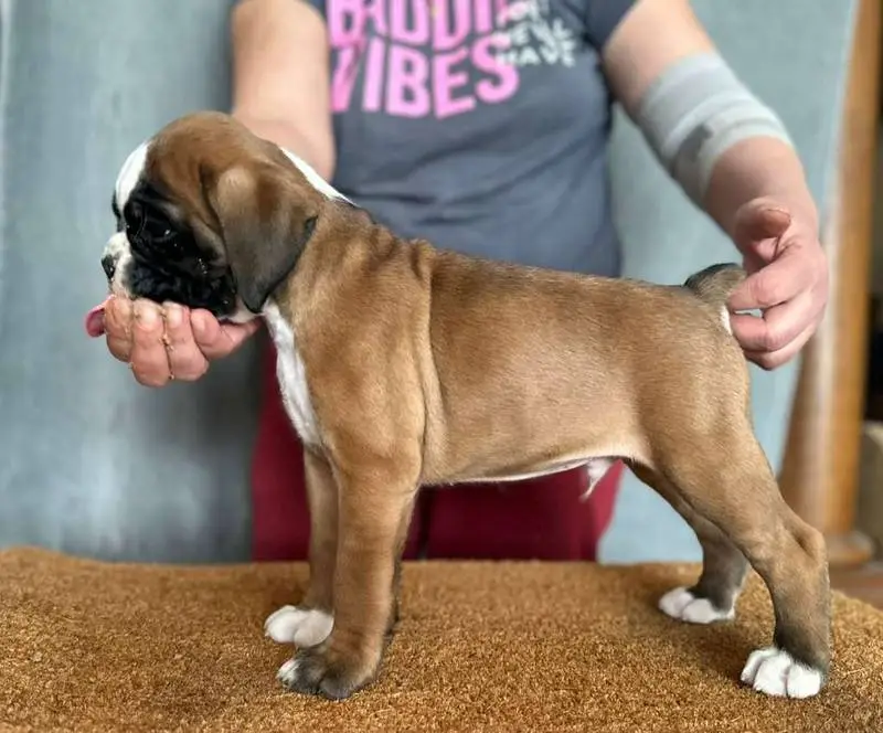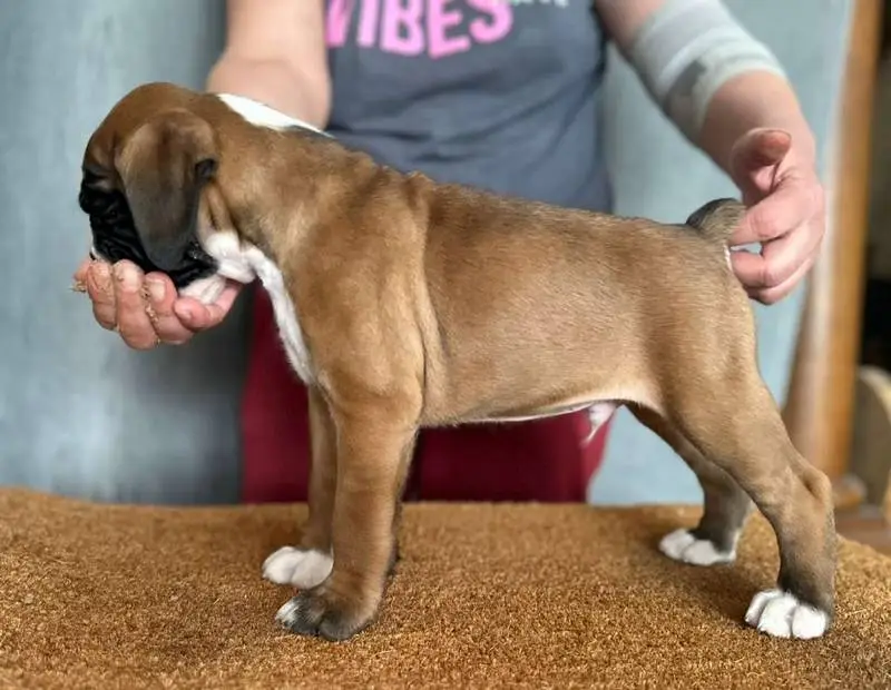 Introducing our Fawn male 2 Boxer puppy from Litter G at NorDom Kennel, born on December 20, 2025. This beautiful puppy is health checked, vaccinated, dewormed, ensuring she is ready for her new home. His parents, Ceres Gold for NorDom and Nemezida NorDom, are award-winning champions with excellent health test results. This playful and affectionate puppy will make a wonderful addition to your family. Contact us now to learn more and reserve your new companion today.
