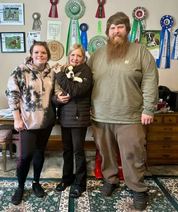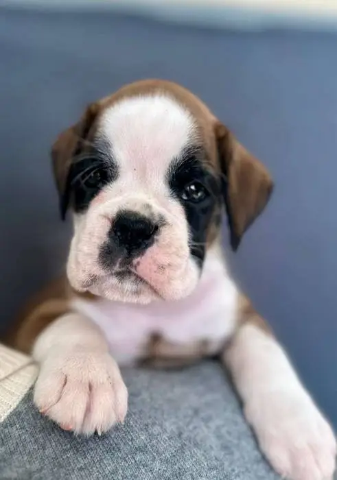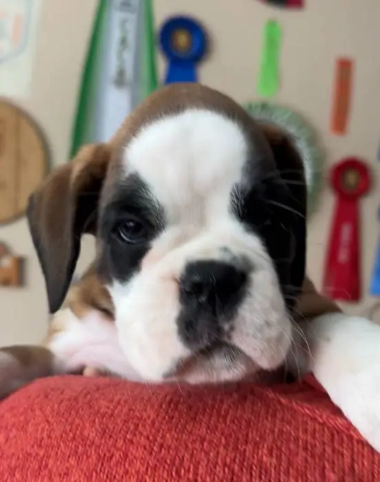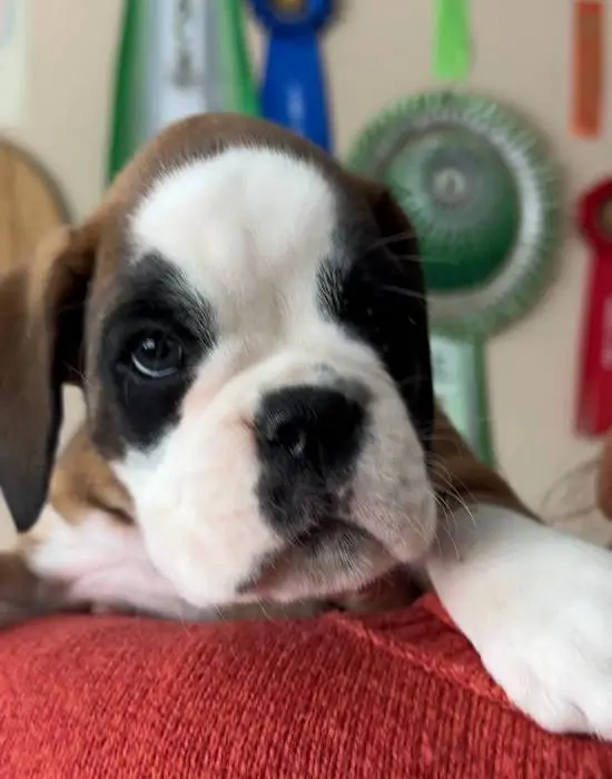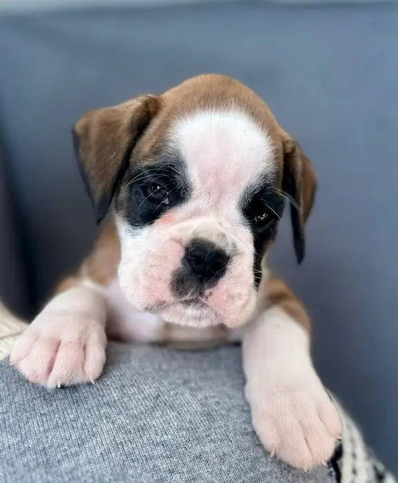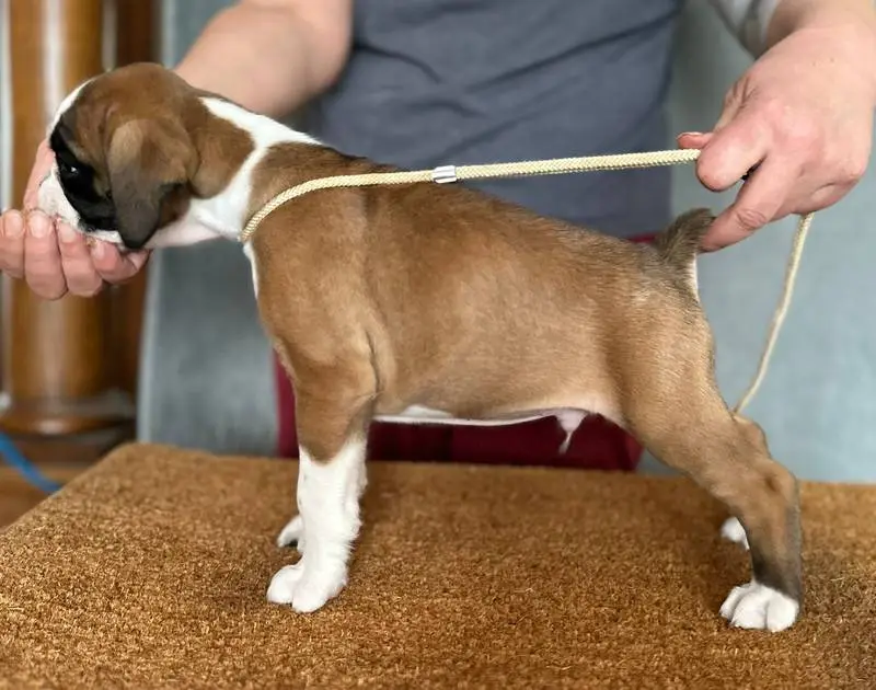 Introducing our Fawn male 4 Boxer puppy from Litter G at NorDom Kennel, born on December 20, 2025. This beautiful puppy is health checked, vaccinated, dewormed, ensuring she is ready for her new home. His parents, Ceres Gold for NorDom and Nemezida NorDom, are award-winning champions with excellent health test results. This playful and affectionate puppy will make a wonderful addition to your family. Contact us now to learn more and reserve your new companion today.